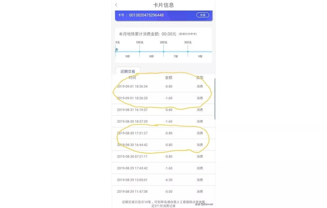 看到公式,有没有点懵?别急别急,小编给您算个账,咱们就用网友@libinnet的换乘为例,由于Ta使用的是普通琴岛通卡(符合优惠换乘条件),换乘的是空调车(这个信息直接关系到现金票价),现金票价应为2元,普通琴岛通卡的刷卡折扣都是8折,所以车费为(2元-1元)×0.8=0.8元,扣费没毛病。