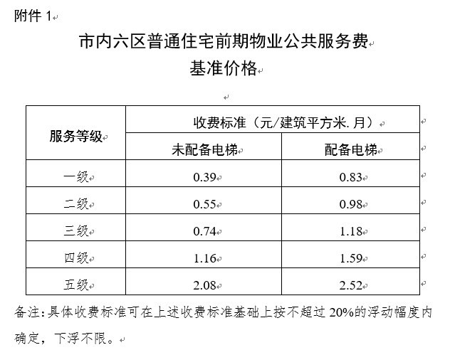 ❖普通住宅前期物业公共服务费实行政府指导价,根据物业服务等级、服务质量、服务成本等因素,实行分等级定价。每个服务等级对应的收费标准为基准价格,具体收费标准可在上浮不超过20%的浮动幅度内确定,下浮不限。