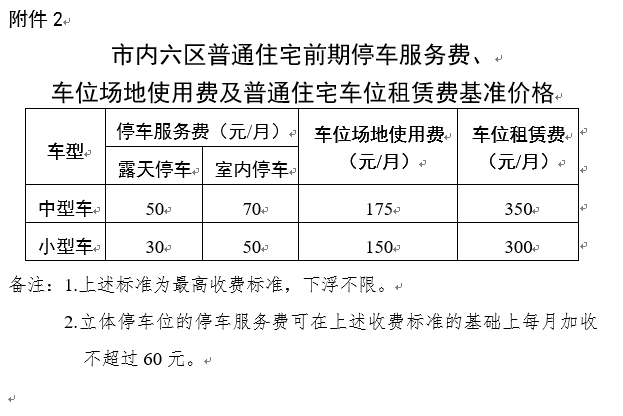 ❖普通住宅车位租赁费和普通住宅前期物业停车服务费、车位场地使用费实行政府指导价,市内六区普通住宅车位租赁费和普通住宅前期物业停车服务费、车位场地使用费标准由市发展改革部门会同市物业主管部门制定,具体收费标准见下表。