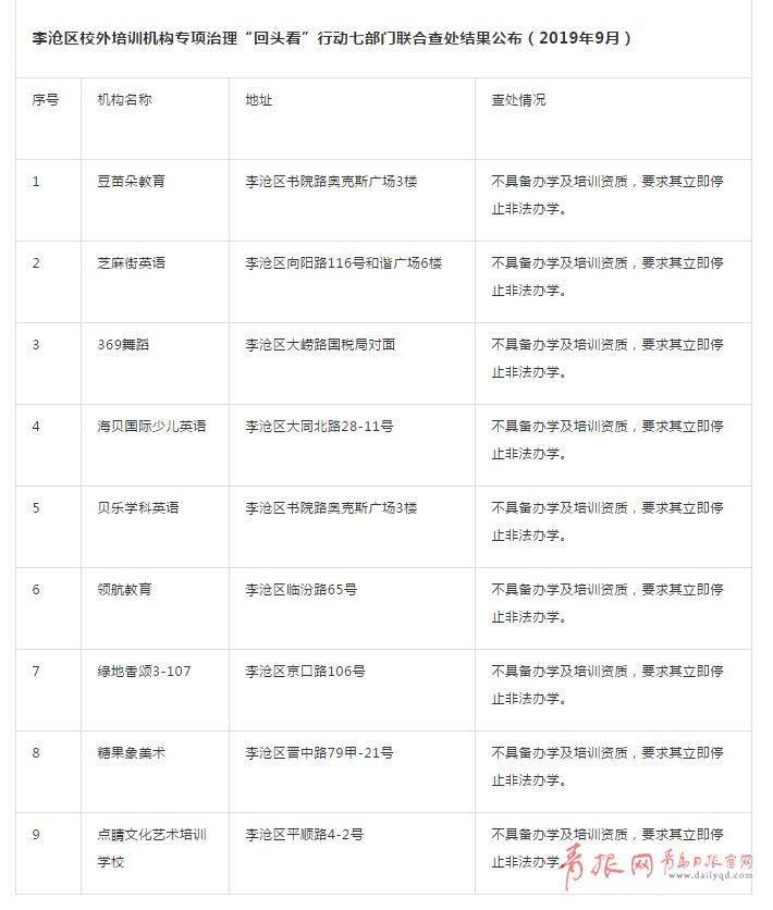 任性姐从李沧区教体局了解到,李沧区再次开展校外培训机构专项治理“回头看”联合查处工作。日前,李沧区教体局、民政局、人社局、市场监管局、综合行政执法局、公安李沧分局、消防大队七部门联合执法,督查查处了9家非法培训机构。这9家机构均不具备办学及培训资质,被要求立即停止非法办学。
