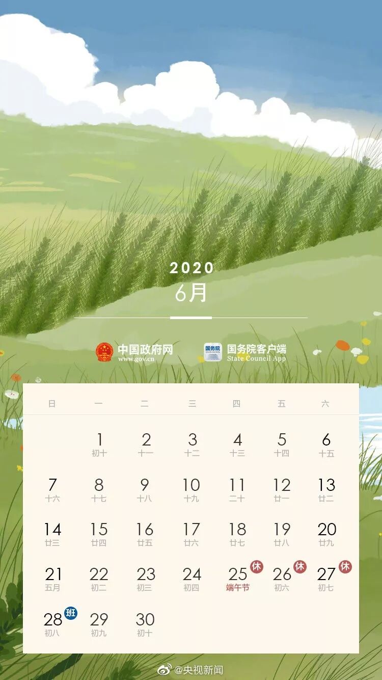 2020年端午节:6月25日至27日放假调休,共3天。6月28日(星期日)上班。