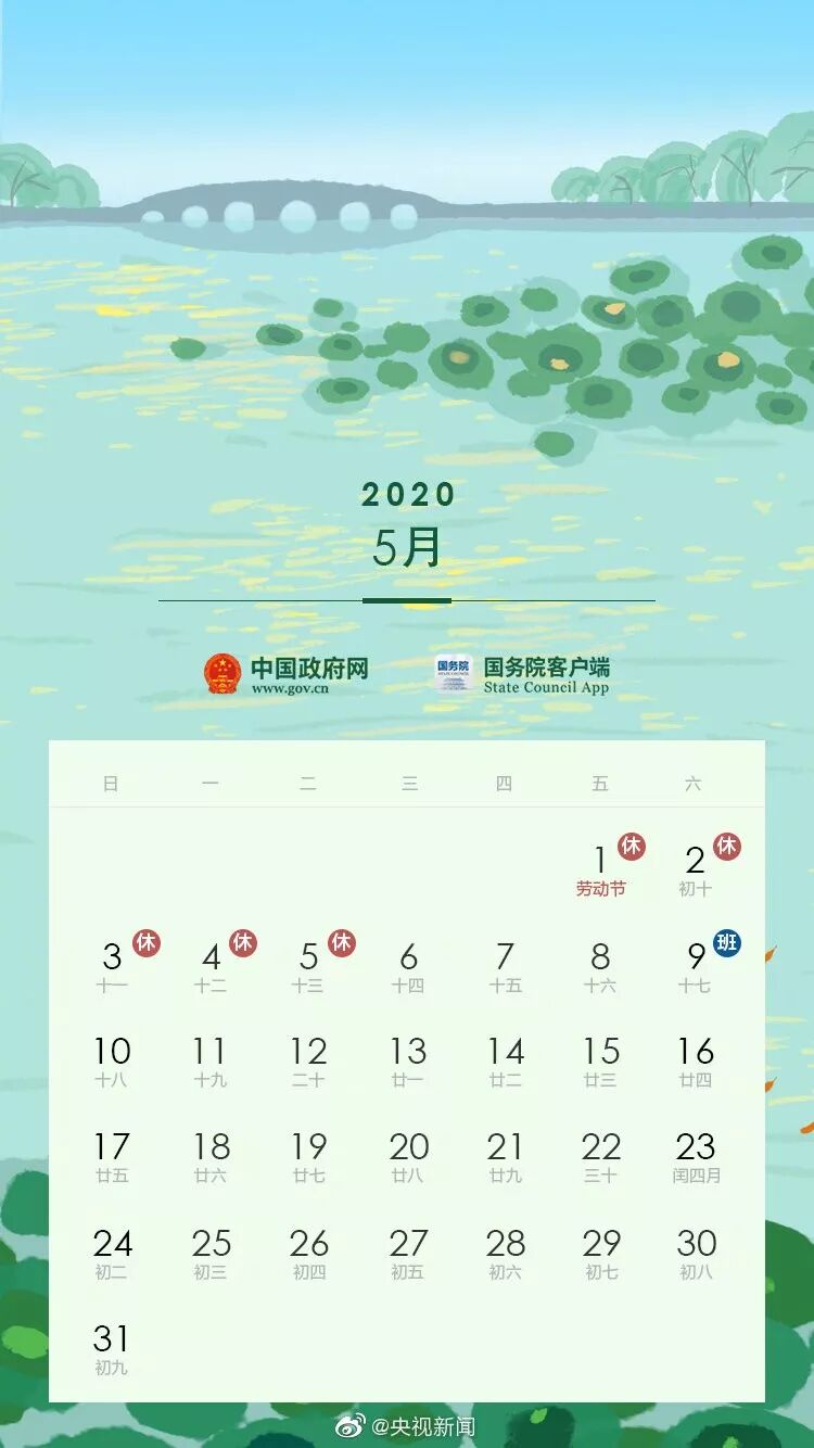 2020年劳动节:5月1日至5日放假调休,共5天。4月26日(星期日)、5月9日(星期六)上班。